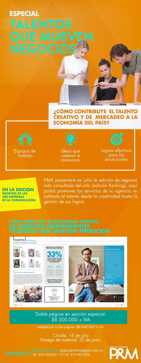 No se pierda en julio el Especial: Talentos que mueven negocios. Un análisis enfocado a conocer ¿Qué caracteriza al talento creativo y de mercadeo que movió la economía en 2017? Así como a conocer los equipos de trabajo y las ideas que crearon para innovar y lograr los resultados esperados por los anunciantes.