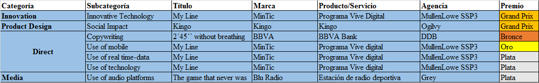 Para Colombia fue uno de sus mejores festivales. Cinco jurados (Marialejandra Urbina, regional director of planning and strategy, head of planning de MullenLowe SSP3 y miembro del Concejo Global de Planning de MLG; Daniel Bermúdez, founder and chief creative officer de Fantástica/Bombai; Paola Aldaz, VP Marketing de Mastercard Colombia y Ecuador; Lina María Rivero, VP strategy & innovation Latam de Havas Media; Andrés Ortiz, senior partner de Dattis), 22 metales (2 Grand Prix, 4 Oro, 10 Plata, 6 Bronce) y un Young Lions de Oro, son el resultado de la histórica participación de Colombia en Cannes.