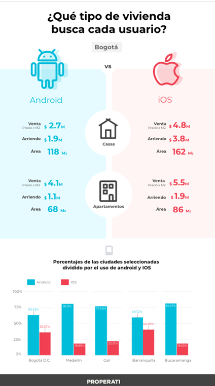 “Pudimos identificar que en Bogotá, Medellín, Cali, Barranquilla y Bucaramanga, las personas utilizan más Android para la búsqueda de inmuebles, con un porcentaje del 67% de interacciones. Mientras tanto, en iOS corresponde a un 33%. Además, el análisis determinó que las búsquedas que se realizan desde iPhone son de apartamentos o casas de superficies más amplias que las de los inmuebles que se consultan desde Android”, afirmó Santiago Morales, gerente de relaciones institucionales de Properati Colombia.