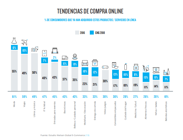 En cuanto a las compras en línea, impulsadas por los consumidores que valoran el tiempo y buscan facilidad para sus vidas, el panorama se muestra cada vez más prometedor. Según un estudio de Nielsen sobre comercio electrónico en 30 países, las ventas en línea de productos de consumo masivo crecen cinco veces más rápido que las ventas presenciales de este mismo tipo de productos. Para 2020, el comercio electrónico mundial de esta industria tendrá un valor de más de 400.000 millones de dólares estadounidenses (68.708 millones de dólares se harían en nuestra región) y abarcará entre el 10% y el 12% de participación del mercado en el sector de productos de consumo masivo.