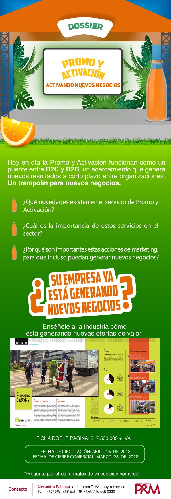Haga parte de nuestro especial: Promo y activación: activando nuevos negocios?, comunicándose con Alexandra Palomar, directora comercial, escribiendo al correo apalomar@revistapym.com.co, o llamando al número 618 1458 ext. 115.