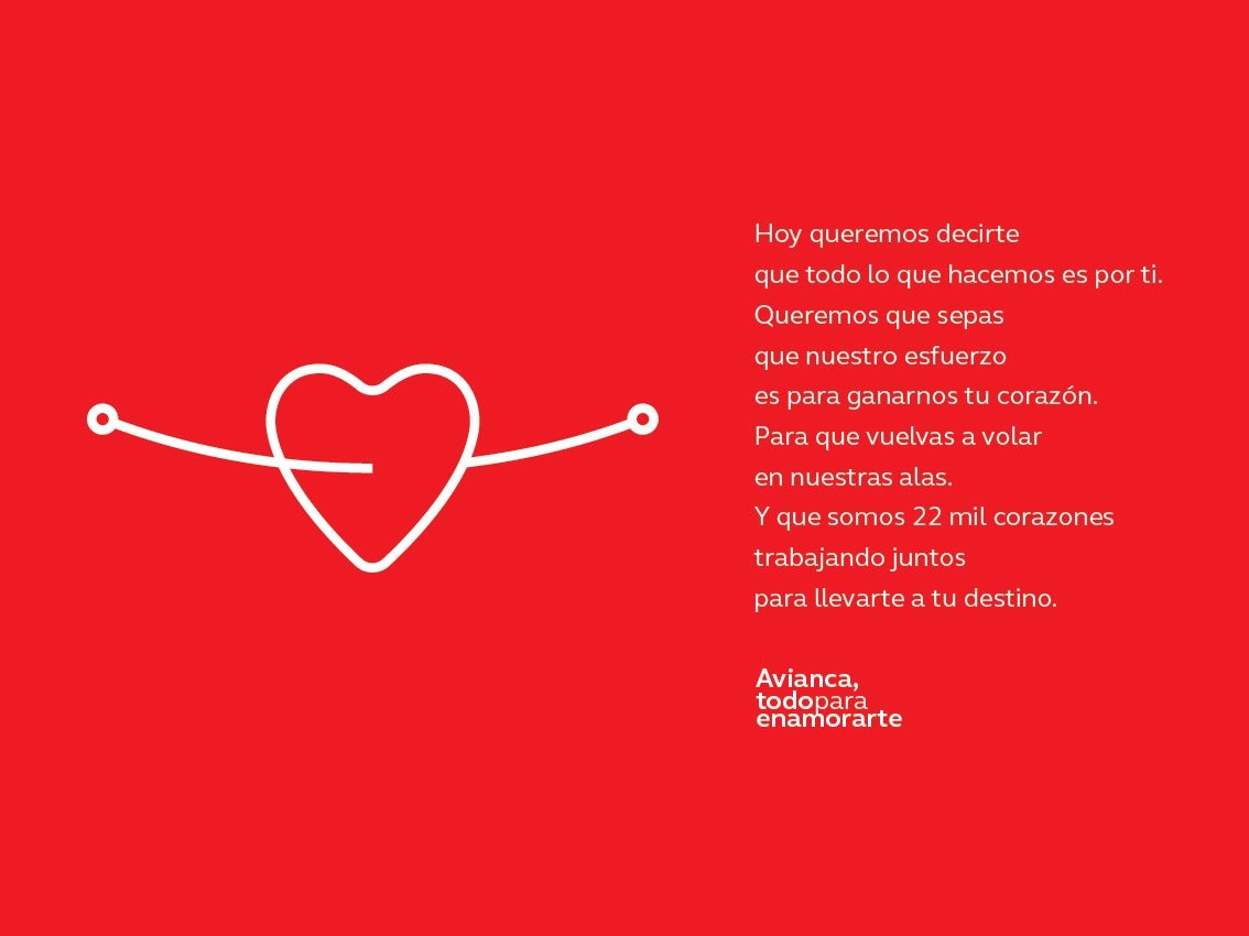 Con presencia en diferentes medios de comunicación y una acción en el Centro de mantenimiento de Avianca, la compañía presentó la campaña «Todo para enamorarte», una idea basada en el cuidado de los detalles para mostrarle a los viajeros que «todo el esfuerzo que realiza la compañía es para ganarse su corazón», como afirma la pieza visual.