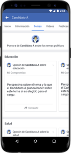 La Pestaña de temas estará disponible también para Páginas de funcionarios de gobierno y partidos políticos. En caso de que un candidato no incluya sus propuestas sobre un determinado asunto, el espacio quedará en blanco.