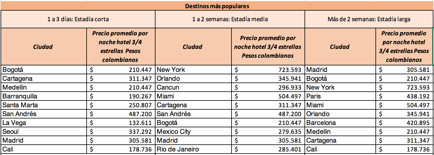 De los datos se desprenden tres tipos de estadía según la duración del viaje: corta de 1 a 3 días, media de 1 a 2 semanas, larga de más de 2 semanas. Tomando este dato como referencia, se analizaron los destinos más buscados por los colombianos. Así como el gasto promedio por noche en hospedaje.