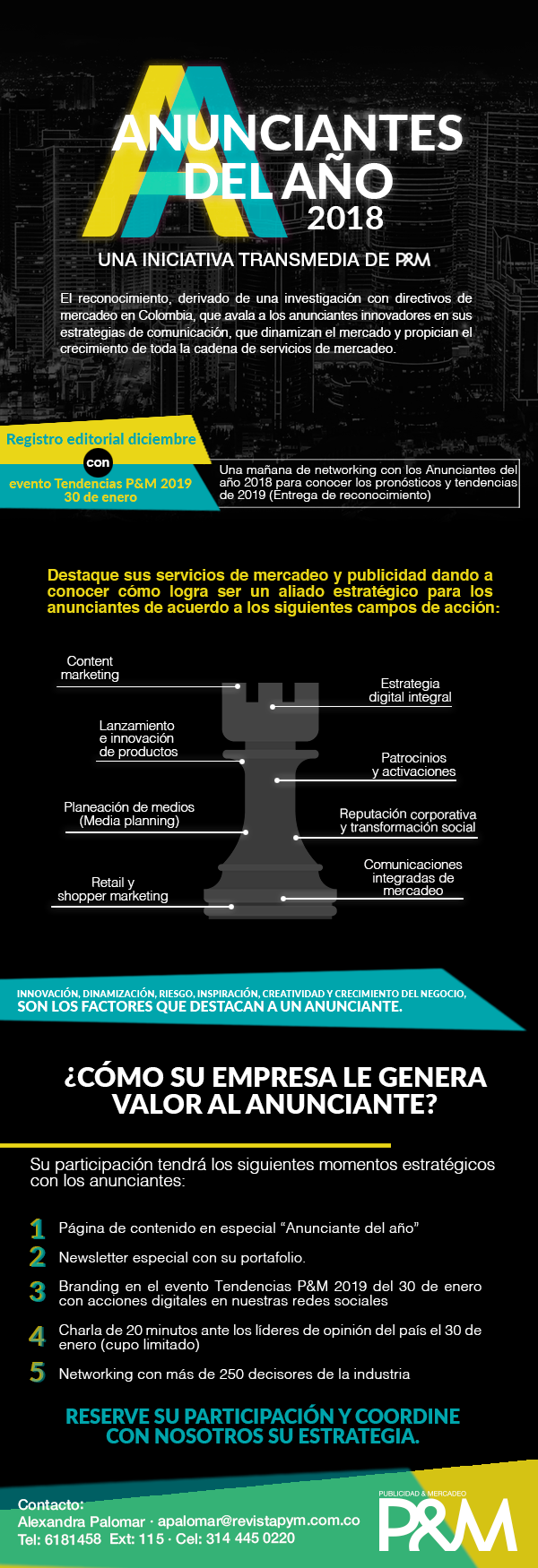 P&M, como referente de información y tendencias del mercadeo, la publicidad y las comunicaciones en Colombia, lanza Los Anunciantes del Año. Un reconocimiento, que se realiza por primera vez en el país, para destacar anualmente a las compañías que, con sus estrategias de mercadeo y comunicación, contribuyen al desarrollo, son modelo a seguir y sirven de inspiración para otras organizaciones.