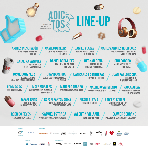 Adictos 2016 cuenta con el apoyo de agencias como Ogilvy Colombia, J. Walter Thompson Colombia, Sancho BBDO, Sístole, Fantástica, Geometry Global Colombia, McCann Colombia, MullenLowe SSP3, Glue Colombia, Young & Rubicam Group y el programa de Publicidad Internacional de la Universidad Sergio Arboleda; agencias e instituciones que creen y le apuestan al futuro de la industria publicitaria de la región, un aporte para que los jóvenes conozcan de primera mano las experiencias reales profesionales en su campo.
