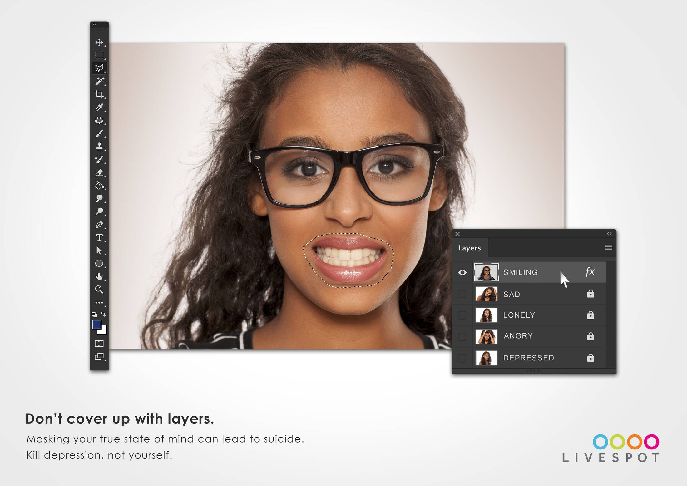 Otro ejemplo se publicó en Nigeria en octubre de 2019, para la marca Livespot 360. Se trató de una campaña impresa que resaltaba como mensaje: “Las personas que sufren de depresión pueden ser potencialmente suicidas, pero prefieren esconderse bajo una falsa felicidad”.
