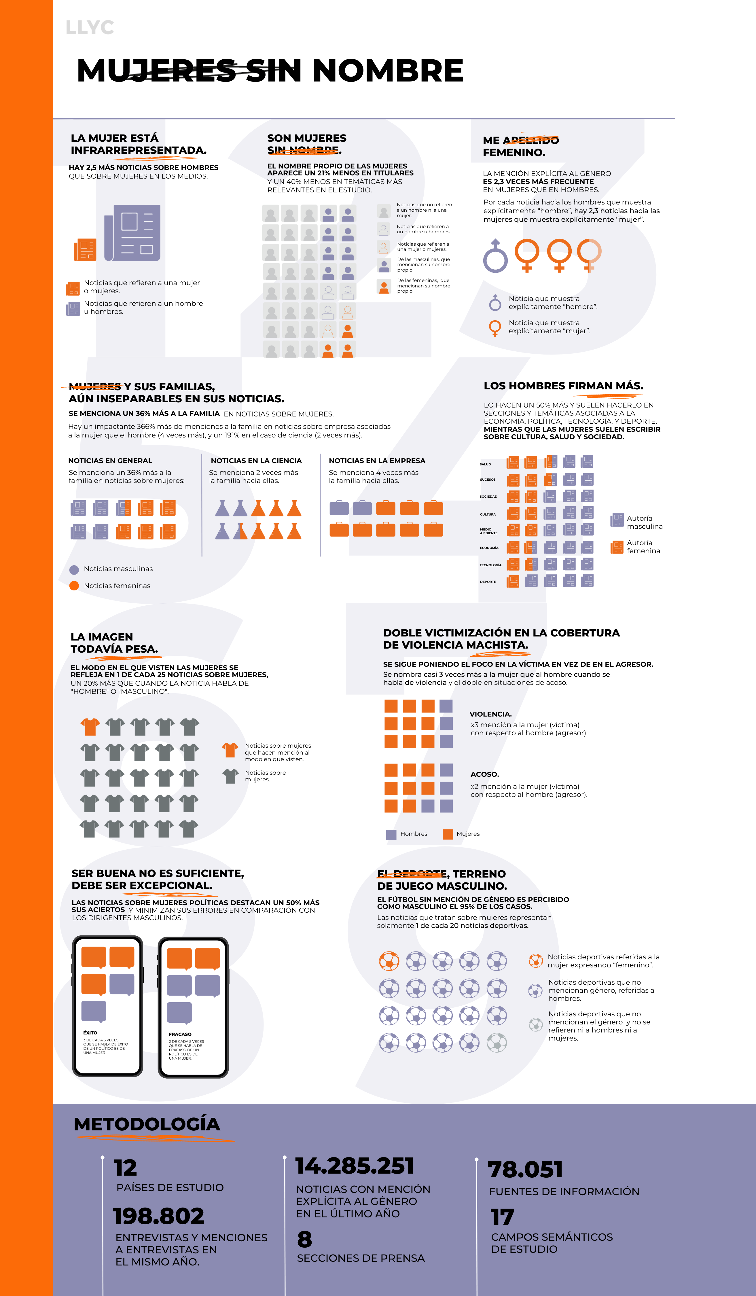 La presencia y el tratamiento de la mujer en los medios de comunicación sigue siendo un desafío pendiente, aunque se ha avanzado en los últimos años. Existen 2,5 noticias más sobre hombres que sobre mujeres y aparecen citadas un 21% menos en los titulares. No solo están aún infrarrepresentadas y son más anónimas. Además cuando aparecen es más frecuente que haya una mención explícita a su género o a su familia y firman un 50% menos. La economía, la política, la tecnología y el deporte son los sectores donde la brecha es más evidente. Son algunas de las conclusiones que recoge el informe ‘Mujeres sin nombre’ realizado por LLYC en el marco del 8M, Día Internacional de la Mujer.