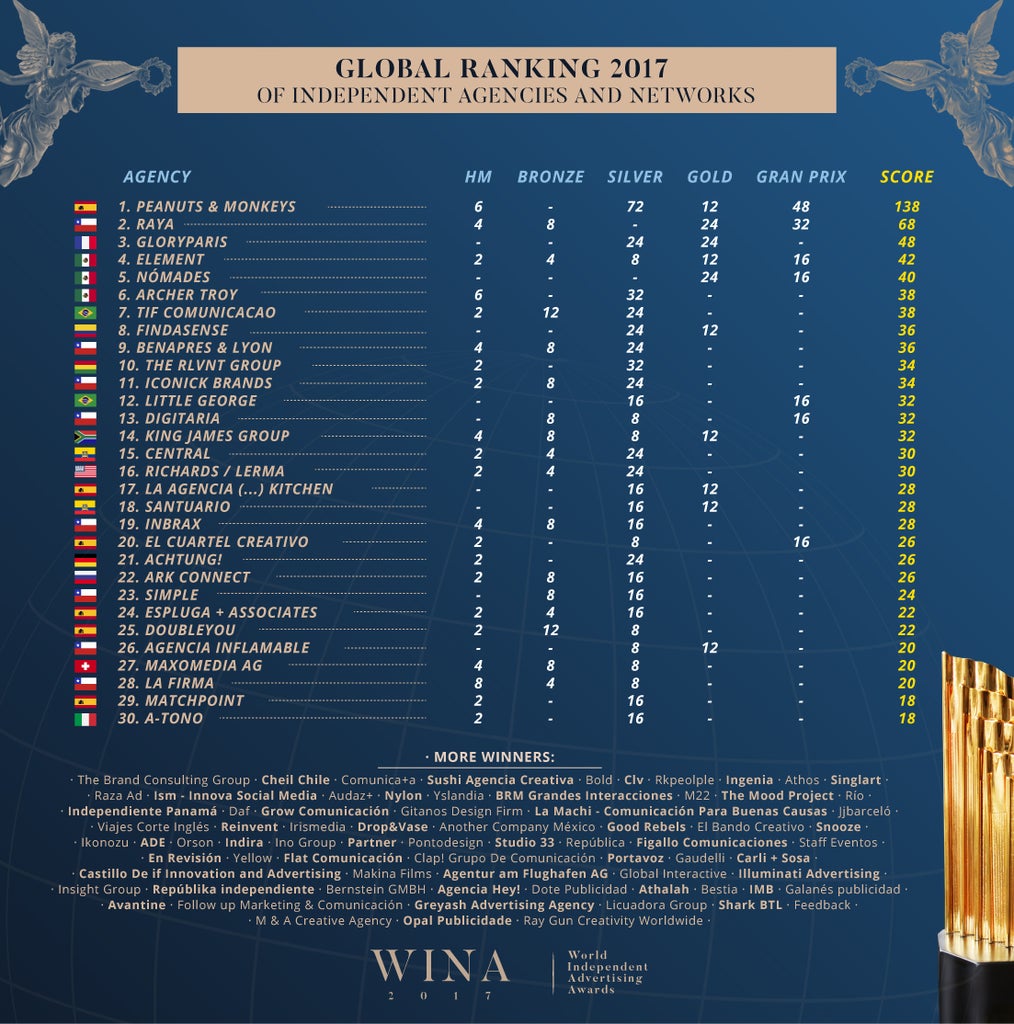 - Peanuts & Monkeys es la agencia más premiada del WINA 2017 y podría ser la agencia top ranking sumando las dos ediciones del festival