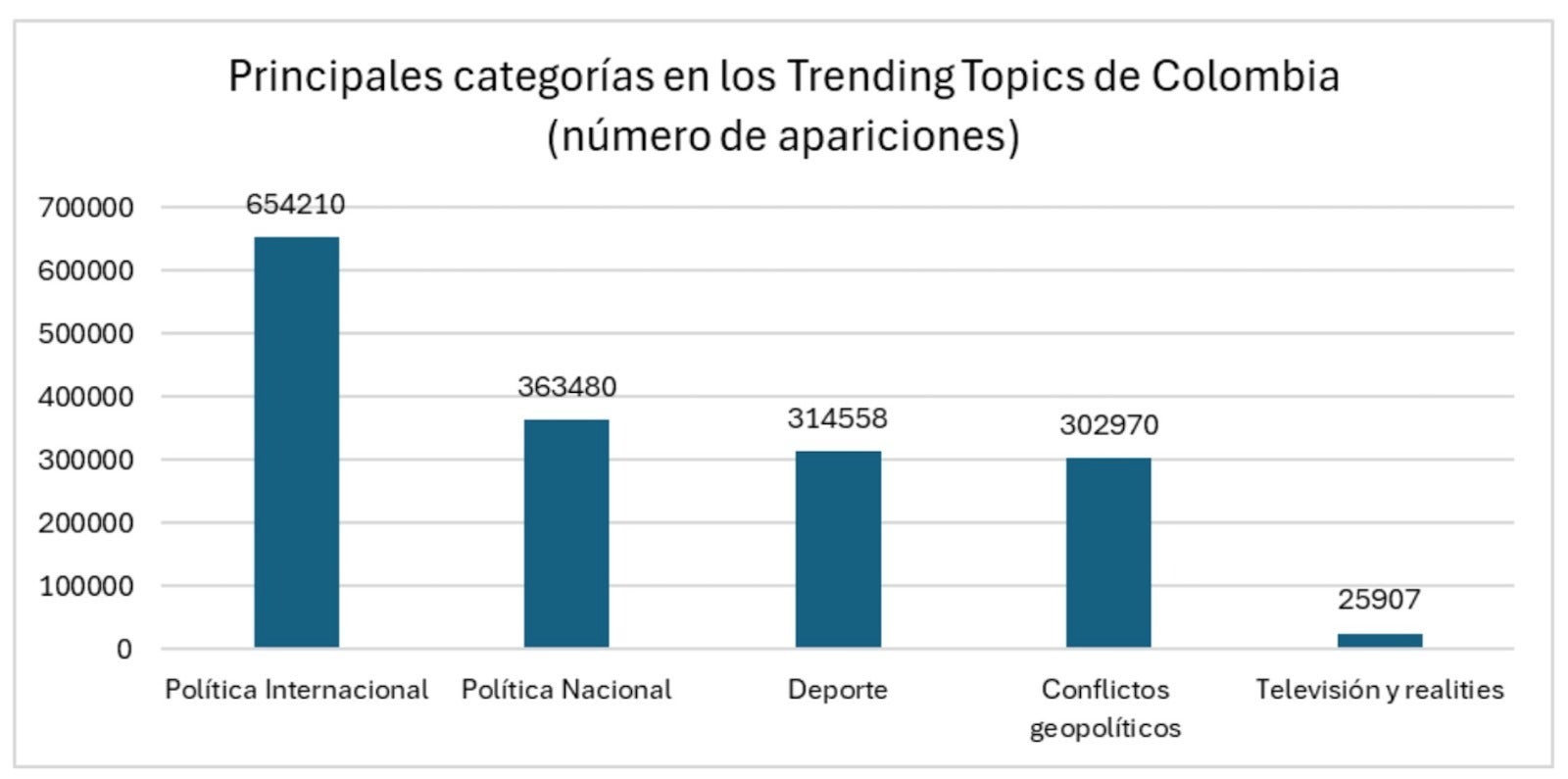 Según el gráfico de distribución por categorías, la política internacional encabezó ampliamente los Trending Topics de Colombia en 2025, con más de 654.000 apariciones, seguida por la política nacional, y el deporte.