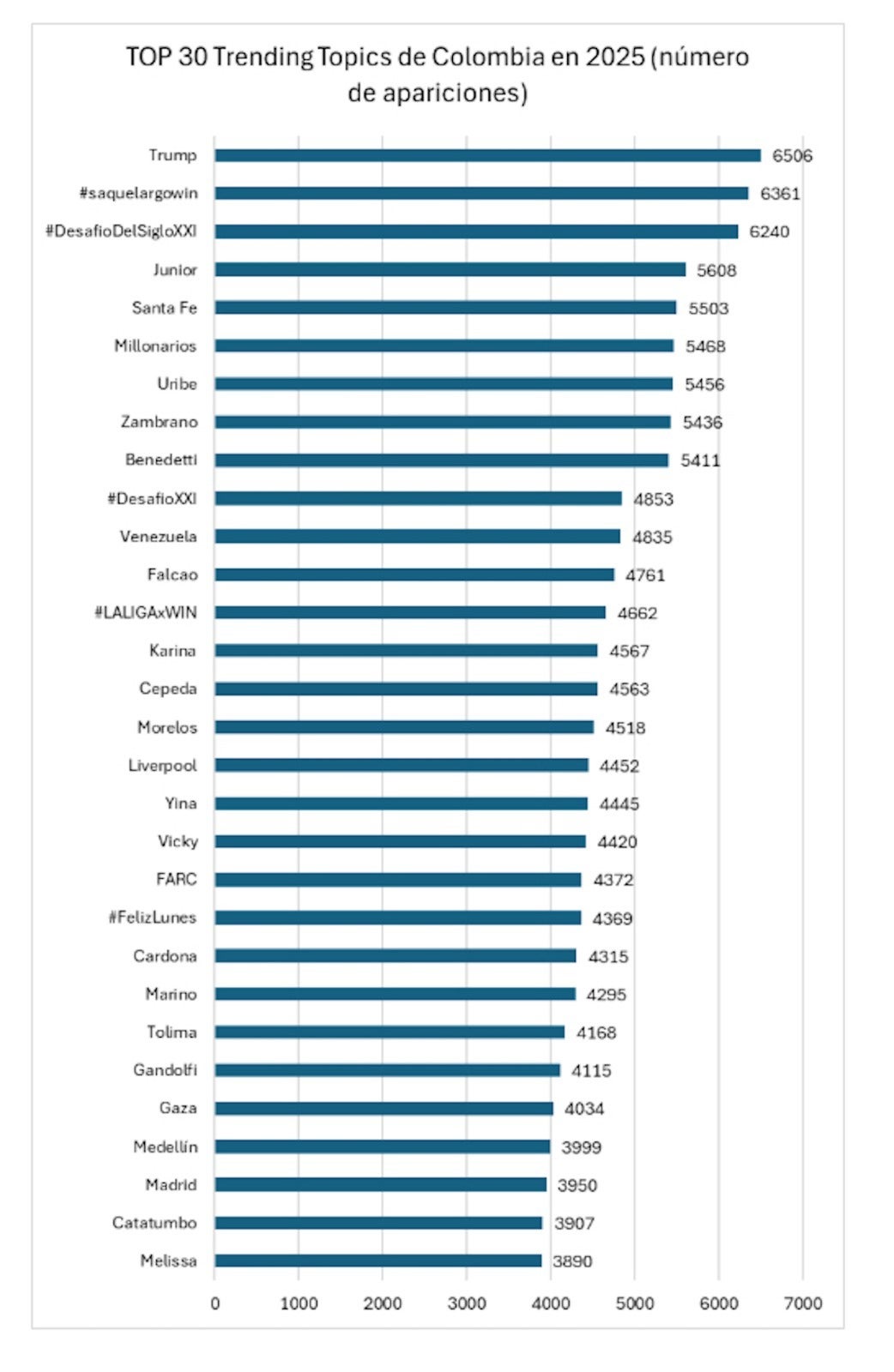 Entre el 1 de enero y el 31 de diciembre de 2025 se identificaron 7.690 expresiones distintas dentro de los Trending Topics de Colombia, que en conjunto superaron 1,6 millones de apariciones. Muchos de estos términos se repitieron de manera recurrente durante distintos meses, lo que evidencia la persistencia de ciertos asuntos en la discusión digital del país.