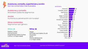 Finalmente, se evidenció que las series y películas más buscadas hacen parte de la categoría de aventura, comedia y superhéroes. Además, Askids recomienda que para atraer a los adolescentes, son claves los contenidos de acción, ciencia ficción y comedia.
