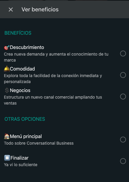 La herramienta de Conversational Business tiene múltiples conceptos para explorar y maneja lenguaje sencillo. Por otra parte, el chatbot tarda menos de un minuto en responder luego de que el usuario decide qué información que desea conocer. Cuando la exploración de algún pilar acaba, se ofrecen los demás ítems para conocer a fondo la utilidad de la herramienta.