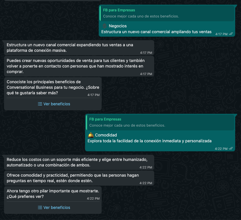 Por otra parte, si el usuario desea ir al menú principal nuevamente, podrá encontrar otros pilares para explorar, algunas de las respuestas redireccionan a la página de Facebook for Developers, donde se halla contenido explicativo sobre múltiples herramientas como WhatsApp API, WhatsApp Business, consejos para buenas prácticas tanto en Messenger como en WhatsApp y otras herramientas que ofrece Facebook.