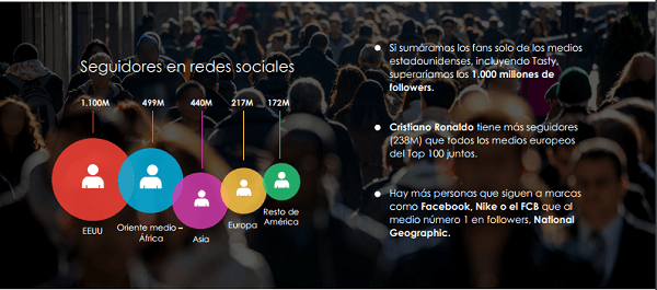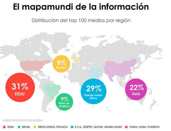 3 regiones se reparten el pastel de los medios y sus seguidores en redes: Estados Unidos, Asia y Oriente Medio, con Emiratos Árabes Unidos, Qatar y Egipto como principales protagonistas. Para elaborar el Top 100 se han tenido en cuenta únicamente redes sociales occidentales (Facebook, Twitter e Instagram), resulta sorprendente como de los 6 medios chinos en este ranking, 4 aparecen entre los 25 con más seguidores.