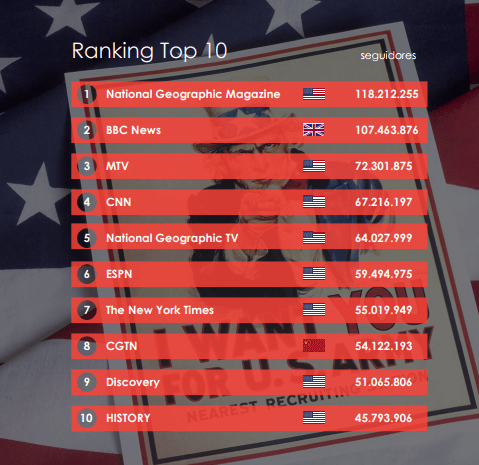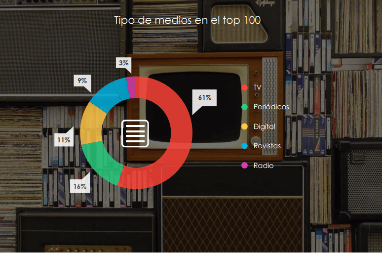 En el ranking general, se observa el dominio de la televisión sobre los demás medios, ocupando 59 de las 100 primeras posiciones y acumulando incluso más seguidores, casi un 67% del total. La prensa escrita es la siguiente en representación, con 15 periódicos y 10 revistas en el ranking.