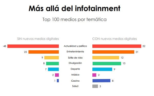 Así mismo, el estudio indica que tanto los temas de política como los de entretenimiento son los que cada vez tienen menos fuerza, mientras que temas relacionados con naturaleza, historia y salud son los más leídos.