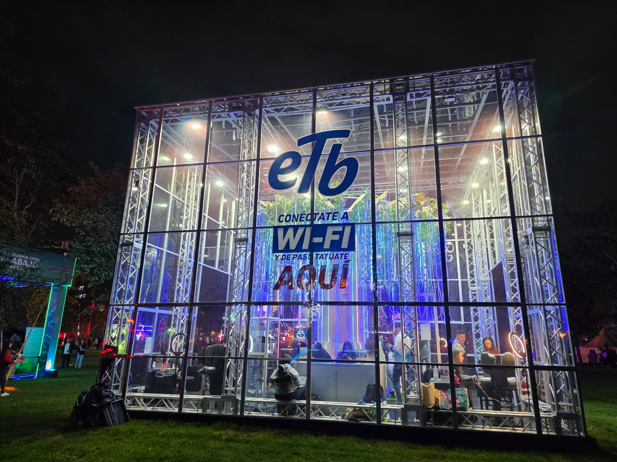 Con cables led blancos, azules oscuros, azul claro y aguamarina, la activación de ETB era, de entrada, impactante visualmente. Adicional a los puntos de carga y el WiFi, la activación tenía un puesto de tatuajes temporales y una ruleta para ganar premios como impermeables, bonos y más.