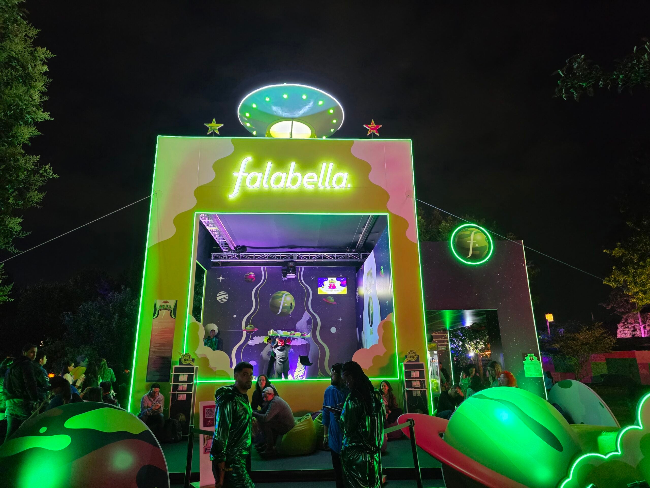 El exterior de esta activación era impactante. Su color era el verde identitario de Falabella y la temática eran otros planetas. Por eso, incluía planetas de colores, y naves espaciales. Fue, posiblemente, la activación con mejor curaduría visual y creativa en el FEP.