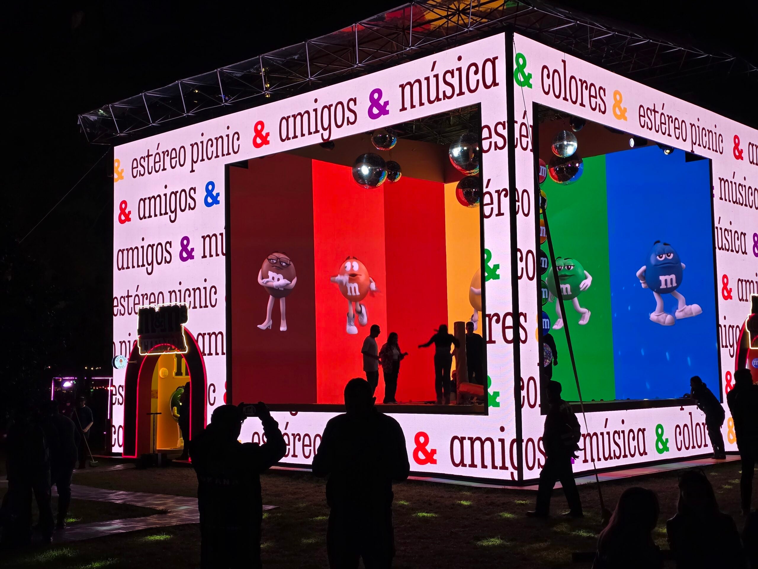 Creada por el Okana BTL Group, la activación era deslumbrante: Con una fachada cuadrada hecha ciento por ciento de paneles de video en los que se mostraban primero un fondo blanco, con letreros que decían “musica”, “colores”, “amigos”, juegos” y “estéreo picnic” unidos por & de los colores de los dulces. Luego, ese fondo se “derretía” en cientos de M&M´s.