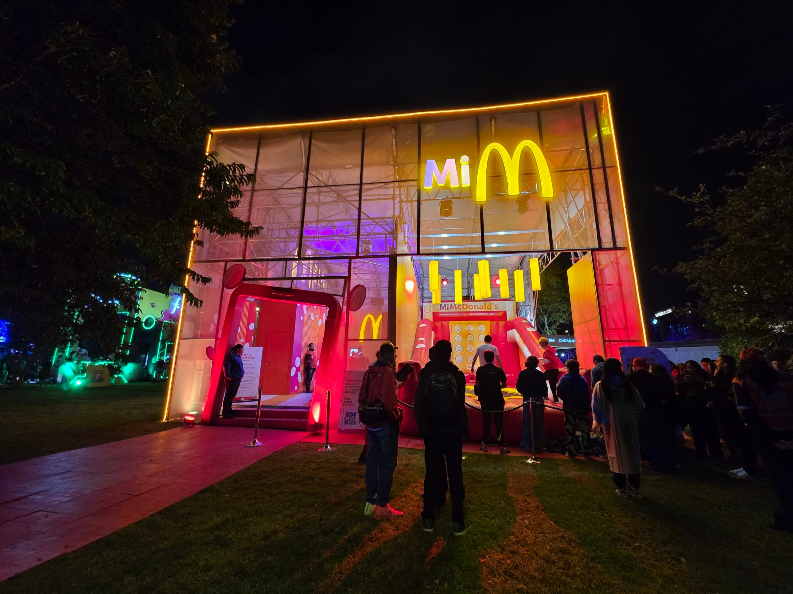 Adentro, la activación era un juego: Seis personas entraban y se paraban seis “puestos” rodeados de una piscina de colores. En el centro había un palo horizontal que se movía en círculos y que las personas debían superar agachándose o saltando. Quien ganara, podía escoger qué de la merch (una de las más lindas del festival) querían: Gorros, chaquetas, medias, bolsos, vasos que cambiaban con la temperatura y porta celulares, todo con M&M´s por todas partes. En el segundo piso había una zona VIP que era un lounge con sofás y sillas plateadas y con una bola disco. Como bonus, lanzaron de la mano de McDonald´s el McFlurry de M&M´s FEP que era morado y tenía arequipe.