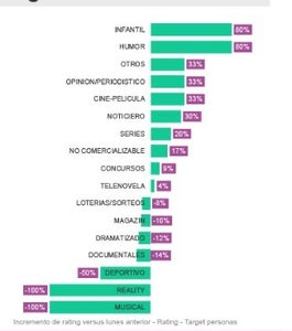 Los géneros de televisión que mayor aumento en audiencia han tenido, son el Infantil y el Humor, incrementando un 80% su rating este 16 de marzo, respecto al 9 de marzo. Estas cifras encuentran su explicación en las últimas medidas tomadas por el Gobierno Nacional, de suspender las clases en colegios públicos y privados. Los programas de opinión y periodismo, al igual que los noticieros, también han visto un aumento en el rating de este lunes.