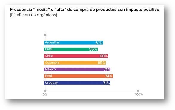 Consultados sobre los principales motivos a la hora de comprar productos con impacto positivo, más de la mitad de los encuestados en todos los países los correlacionan directamente con su buena calidad. La preocupación por el futuro y el bienestar de las próximas generaciones están también dentro las razones más comunes destacadas en toda la región.