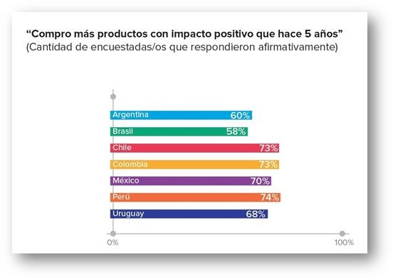Al analizar las diferencias entre países, en México se registró una mayor propensión a comprar productos reciclados (11%). En cambio, los consumidores en Argentina y Brasil demuestran mayor preocupación por el consumo energético y por reparar productos que se dañan. Por su parte, la mayor conciencia sobre el consumo de agua se registra en Colombia y Perú.